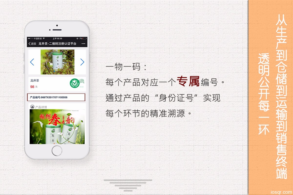 追根溯源,给每一个产品一个专属二维码。通常打印、印刷、喷绘在产品包装上或展示在产品宣传册上使用。您可以通过“扫一扫”体验实际效果。