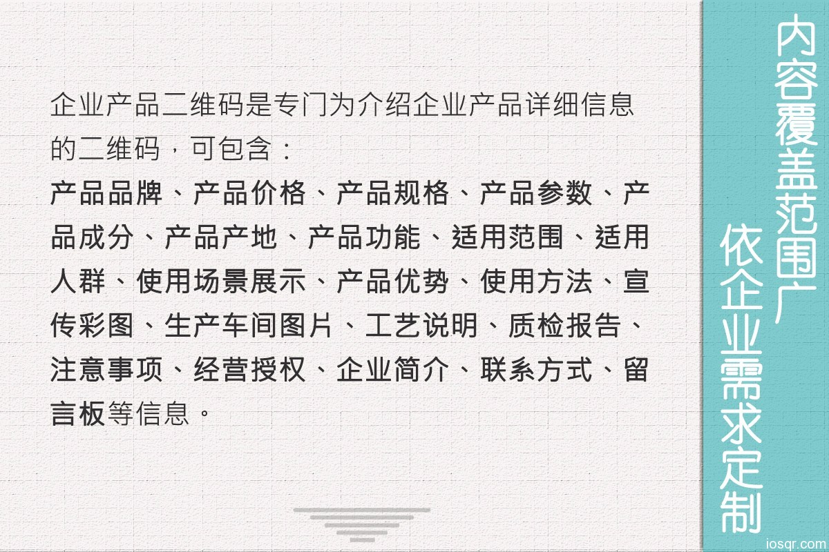 让产品进行自我销售,同一个品类的应用同一个二维码。通常打印、印刷、喷绘在产品包装上或展示在产品宣传册上使用。您可以通过“扫一扫”体验实际效果。