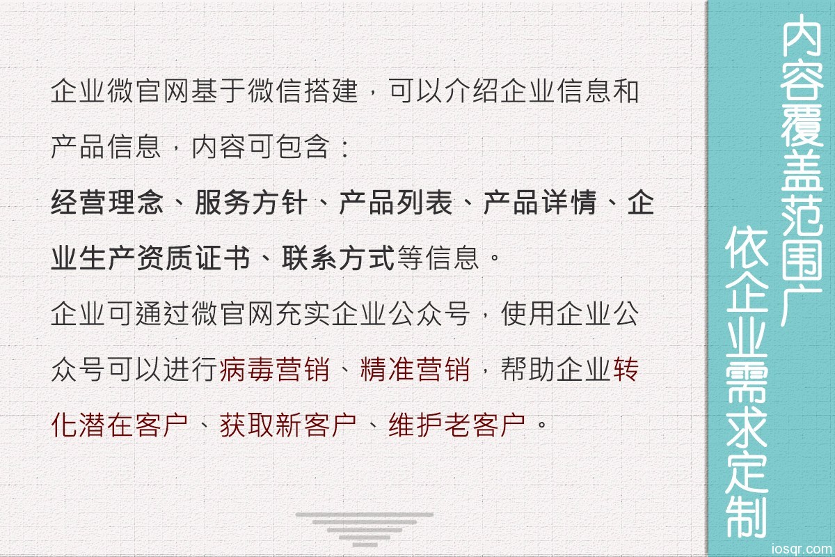 企业微官网是专门为企业展示信息的二维码,基于微信公众号开发。通常打印、印刷、喷绘在产品包装上或展示在产品宣传册上使用。您可以通过“扫一扫”体验实际效果。